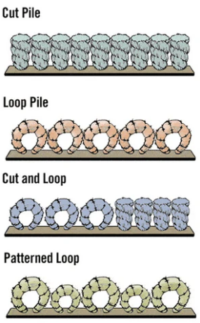 There are a few different types of loop pile, all are easily identifiable by their fun loops rather than the open ended tufts of the cut pile. The classic loop pile consists of same size loops, while patterned loops are arranged in a pattern of loop sizes. Cut and loop are common in carpets with embedded designs and combine the loop and cut pile weaves.